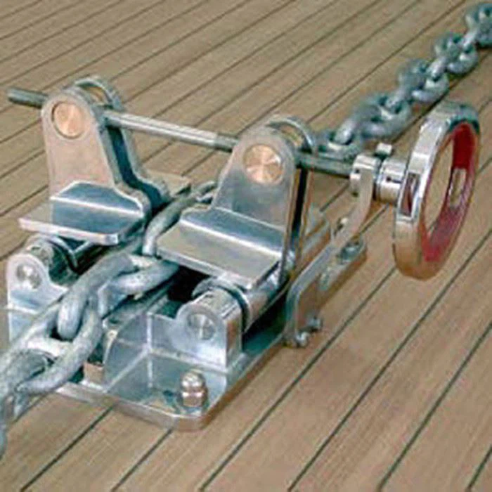 Zarážka reťaze, známa tiež ako zarážka reťaze alebo zarážka kotvovej reťaze, označuje špeciálne zariadenie na zaistenie alebo upnutie kotvovej reťaze. Je pripevnený medzi kotviacim strojom a rúrkou kotvovej reťaze, oddelený od kotvového reťazového kolesa, a nesie ťahovú silu kotvy a kotevnej reťaze, keď je kotva uzavretá a ukotvená, takže ju nemožno preniesť na kotvu. Reťazové koleso. Bežne sa používajú špirálová reťaz, nožová reťaz, jazyková reťaz, vačková reťaz, reťazová reťaz a valčeková reťaz.